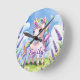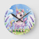 Haga el tiempo mágico con este unicornio personalizado en un reloj de pared de campo lavanda. Con suaves cielos pastel, flores florecientes y el nombre de su hijo, es perfecto para guardería, sala de juegos o decoración de dormitorio. Un regalo encantador y funcional para los amantes del unicornio.