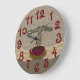 Reloj con fondo texturizado, con taza de café y texto texturado de café. Los colores marrón y rojo oscuro.