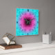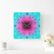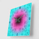 Diseño de arte digital en un patrón abstracto simétrico de tonos azul claro, rosa y morado que se asemeja al centro de una flor. Números azules diseñados por personalizados en las horas 3, 6, 9, 12.