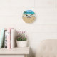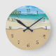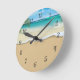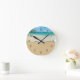 Relojes de decoración de pared con temática costera de playa tropical diseñados con una imagen gráfica de un hermoso océano tropical y arena con números de reloj de pulsera de lujo que se pueden entregar en la pared de su casa con estilo.