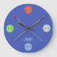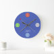 El reloj de pared de costura del tema hecho en azul con los gráficos de los botones coloridos que marcaban las horas, de las 3, 6, y 9 12 y de un perno y de una aguja de costura cruzó en el centro. Personalice el texto blanco para su sitio de costura.