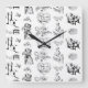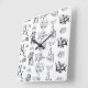 El reloj de pared blanco y negro del cuadrado del modelo de Toile, por Kristie Hubler, con el gallo, las ruinas antiguas del castillo, baile de los pares, pájaros que se besan, árboles, pájaros jerarquiza con los huevos para la prosperidad, hojas, ramo floral, rosas, bebé que lanza una flor, y corderos