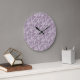 Un reloj de pared redonda de moda, con un patrón de Lilies-of-the-Valley en blanco contorno en un fondo malva; de la colección Posh & Painterly 'For the Love of Lilies'.