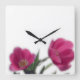 Esto es un reloj de pared cuadrado adornado con una fotografía de tulipanes rosados hermosos.