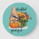 Celebra este Día de Acción de Gracias con el simpático Gnome de Acción de Gracias que disfruta de una rebanada de pastel de calabaza, con un diseño de letras que dice agradecido y agradecida.