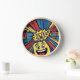Reloj de pared de arte pop que atrapa los ojos con formas de estilo cómico brillante en rojo, amarillo y azul. Un artículo divertido y moderno