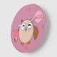 Este impresionante reloj presenta un bonito búho marrón con grandes ojos adormilados. El búho sostiene un globo rosa pálido bonito y un ramo de flores rosas brillantes envueltas en un cono rosa pálido.