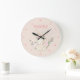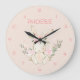 Reloj de guardería con temática de chica dulce con decoración floral blanca y rosa. Este reloj de pared es ideal para un conejito de chicas o para un vivero de árboles. El color de fondo es cambiable.