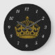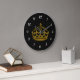 Gold Crown Wall Clock - es un diseño de arte gráfico. El centro es una gran corona dorada decorativa. El fondo es un patrón negro floral grabado en relieve. Los números del reloj son blancos. No dude en personalizar su reloj con un nombre u otro texto como desee.