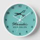 Reloj de pared de peluquería personalizado con nombre de negocio. Decoración personalizada para la peluquería. Color verde azulado o personalizado. Relojes de madera en tonos blancos, negros y naturales. Diseño elegante con el logotipo profesional de tijeras de barbero.