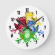 Reloj de pared de las ranas del arco iris con números negros y un diseño rojo, verde, azul, y amarillo de la rana.
