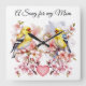 Reloj con temática de pájaros fincos amarillos decorativos, perfecto para la cocina, sala de estar, dormitorio y comedor. Este Reloj de Aves de Mamá Cuta hace un gran regalo para el Día de la Madre, para el cumpleaños de la madre, o para cualquier ocasión o evento. El Bird Art cuenta con una encantadora finca amarilla encaramada en las ramas de cerezo flor con corazón rojo. Coloridas Aves Finch detalladas en tonos exuberantes, que le dan un aire elegante y atemporal al al resto de sus decoraciones. Es un regalo encantador para la madre que es amante de los pájaros o observadora de aves. El verso dice: "Una canción para mi mamá". Personalice este Reloj de pájaro en su contenido de corazón.