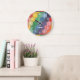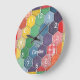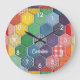 Un reloj temático con patrón de bloque de colcha de hexágono colorido con números blancos grandes y fáciles de ver. Personalízalo con el texto de tu nombre en el editor fácil de Zazzle. Tu elección de redondo o cuadrado. Todos los detalles gráficos simulados digitalmente. Ver muchos otros relojes temáticos de costura en esta colección en Clock O Rama en Zazzle, www.zazzle.com/clockorama