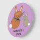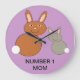 Este impresionante reloj muestra una adorable imagen de una madre y un conejito de bebés sentados uno al lado del otro. El conejo de madre es de color marrón pálido y el conejito de bebé es gris. Ambos conejitos tienen cola blanca adorable y grandes sonrisas en la cara. Un bonito diseño perfecto para el Día de la Madre. Hay texto de personalizable debajo de los conejillos para que puedas personalizar este reloj para tu mamá si quieres.