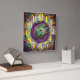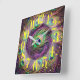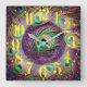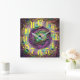 Este diseño de plumas moradas, doradas, verdes y de pavo real proporciona una ráfaga de color como un reloj fácil de leer.