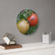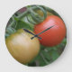 Este reloj impresionante presenta una fotografía de un naranja y un tomate de cerezo rojo creciendo en una planta de tomate en un jardín suburbano. La fotografía fue tomada usando macrofotografía para un resultado detallado.