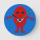Este reloj impresionante cuenta con un personalizado de una uva roja sonriente con ojos negros brillantes y una boca rosada parado en un fondo azul con los brazos abiertos.
