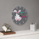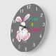 Una pintura original de la acuarela de Anne Ormsby de un conejito con el lema, "lo hace que Hoppen" adorna este reloj de pared de la diversión.