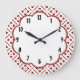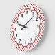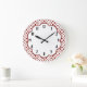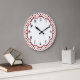 Este es un reloj de cocina de bonito con fondo de esténcil de leer en rojo y blanco y un canto blanco de canto de vieiras. ¡Una vuelta a las cocinas de los años 50 y 60!