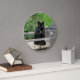 Este hermoso reloj de pared muestra a un gato negro sentado al lado de una lámpara decorativa sobre un puente de madera. Blackie, el gato, se despierta cada mañana y se sienta en este puente del jardín al comenzar su día. Un reloj perfecto para cada amante del gato negro.