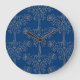 Un elegante reloj de pared, con un patrón floral de efecto dorado sobre un fondo azul profundo, de un diseño digital de Judy Adamson.