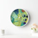En Open Meadow/Fencepostea el diseño de arte abstracto, un sol naranja mira hacia abajo los colores felices de la vida en movimiento —amarillo, azul y verde.