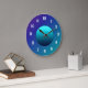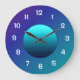 Un reloj de pared simple y atmosférico en azul acuático. Un centro redondo como la luna define este diseño. Numerales blancos con manecillas negras o plateadas.