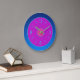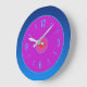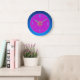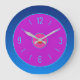 Un bonito reloj de pared en color morado/rosado con un borde atmosférico de azul. Este encantador reloj simplista sería adecuado para todas las áreas de decoración en el hogar.