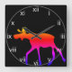 Dibujo curado de una silueta de neón de un alce que cruza el fondo negro de este reloj de pared. El tiempo está marcado por números romanos blancos rodeados por un doble marco circular blanco.