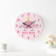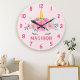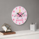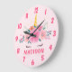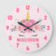 Reloj de pared para dormitorio de niñas Cute Unicorn Eyelashes. Este diseño presenta un hermoso unicornio rodeado de estrellas doradas y flores florales. Reloj de pared de fantasía mágica rosa pastel para niñas. Personalice este diseño personalizado con su propio nombre o texto.