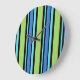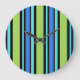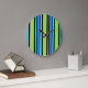 Reloj mural de moda con un patrón de lunas azules a rayas de tumbona en azul turquesa, verde neón, azul brillante y negro. Parte de la colección "Blue Moons" de Posh & Painterly.