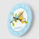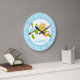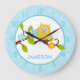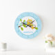 Reloj de búho super lindo con un reloj azul y amarillo con un borde de puntos azul claro.