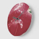 Un gran reloj de pared redonda con una instantánea de gotas de lluvia en pétalos de rosa rojo bonito.
