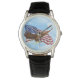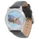 Protector de la corona de los hombres reloj de correa de cuero negro con una imagen de una bandera norteamericana ondeando y un águila calva en vuelo sobre un cielo azul turbio. Vea botón cuadrado coincidente, escultura de foto acrílica, encanto cuadrado, cadena de claves metalizado cuadrada superior, cadena de teclas acrílicas cuadradas de doble cara y cadena de teclas de escultura de fotografía acrílica. Vea la colección completa de Independence Day Watch bajo la categoría ACCESORIOS en la sección VACACIONES.