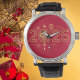 Celebra el año de la serpiente con estilo con este hermoso reloj de 2025. Con intrincados motivos chinos de oro, incluyendo una serpiente, farolillos y símbolos auspiciosos en un vibrante fondo rojo, este reloj es perfecto para sonar en el Año Nuevo chino. La elegante correa de cuero negro complementa el diseño audaz, convirtiéndolo en un accesorio sofisticado para cualquier ocasión festiva. Ideal para regalar o añadir un toque de importancia cultural a su colección, este reloj combina tradición y elegancia en un paquete impresionante.