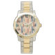 Este reloj masculino tiene un diseño moderno de mediados de siglo de ovales largos en melocotón, verde, azul, verde azulado y marrón claro con líneas negras con círculos en los extremos.