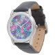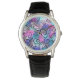 Un pequeño pájaro gracioso en la esquina superior izquierda y elementos florales en un fondo rosa, violeta y turquesa.