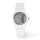 Este hermoso reloj deportivo blanco sólo es a prueba de ducha. Es un reloj de pulsera para mujeres con una cómoda banda de silicio y garantía de 1 año.