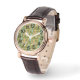 Este reloj de mujeres tiene un diseño moderno de mediados de siglo de rectángulos verdes redondeados con agujeros sobre un fondo de rayas en colores modernos de mediados de siglo. Si te gusta el diseño pero prefieres colores diferentes, envíame un mensaje.