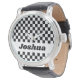 Guay, personalizado, único reloj de una sola especie tiene un diseño de bandera a cuadros en blanco y negro en la parte delantera. Personaliza el frente cambiando el nombre a lo que quieras. Esto le haría un gran regalo a los aficionados a los autos de carrera en su vida. Por favor, consulte los demás elementos de la marca de comprobación de personalizados.