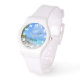 Watch with a scenic tropical photograph. A secluded beach with white sand and turquoise water.