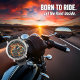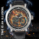 This close-up image showcases a bold watch face with a dynamic illustration of a custom motorcycle. The bike is enveloped in vibrant orange and red flames, creating a sense of speed and intensity against a dark background. Silver numbers and watch hands are clearly visible, making it a striking accessory for motorcycle enthusiasts who appreciate high-energy designs.