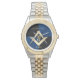 Elegante cuadrado dorado y brújula símbolo masónico con un reloj personalizado de fondo negro y azul.