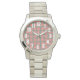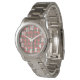 Este reloj femenino tiene un diseño boho de flores de coral que se repite a lo largo del diseño en un campo de verde.
