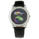 El reloj clásico de correa de cuero de los hombres se muestra en negro con una estampación de balones de fútbol flameantes. Elija este reloj de varios estilos. Personalizar este reloj o compra como está. Imagen de stock all-free-download.com