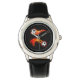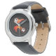 Los niños ven con correa de cuero clásico el reloj de negro con una estampilla de balones de fútbol en llamas. Elija este reloj de varios estilos. Personalizar este reloj o compra como está. Imagen de stock all-free-download.com
