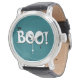 Diseño de texto para Halloween con decoración de gato, araña, búho y redes de araña sobre fondo azul grunge.