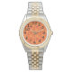 Este reloj de mujeres tiene un diseño moderno de mediados de siglo de círculos naranjas pálidos de diferentes tamaños en un campo de naranja. Si te gusta el diseño pero prefieres colores diferentes, envíame un mensaje.