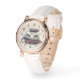 Un reloj con una fotografía con rocas apiladas unas encima de otras. Rodeado de rocas blancas sueltas y flores blancas.