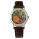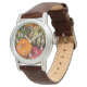 El reloj de correa de cuero marrón clásico de las mujeres con una imagen de una calabaza naranja y verde, y una calabaza amarilla sobre hojas de otoño rojas, doradas y verdes. Cara de reloj plateado opcional. Vea el encanto redondeado y la cadena acrílica rectangular de doble cara. Vea toda la colección de Acción de Gracias de la categoría ACCESORIOS en la sección VACACIONES.